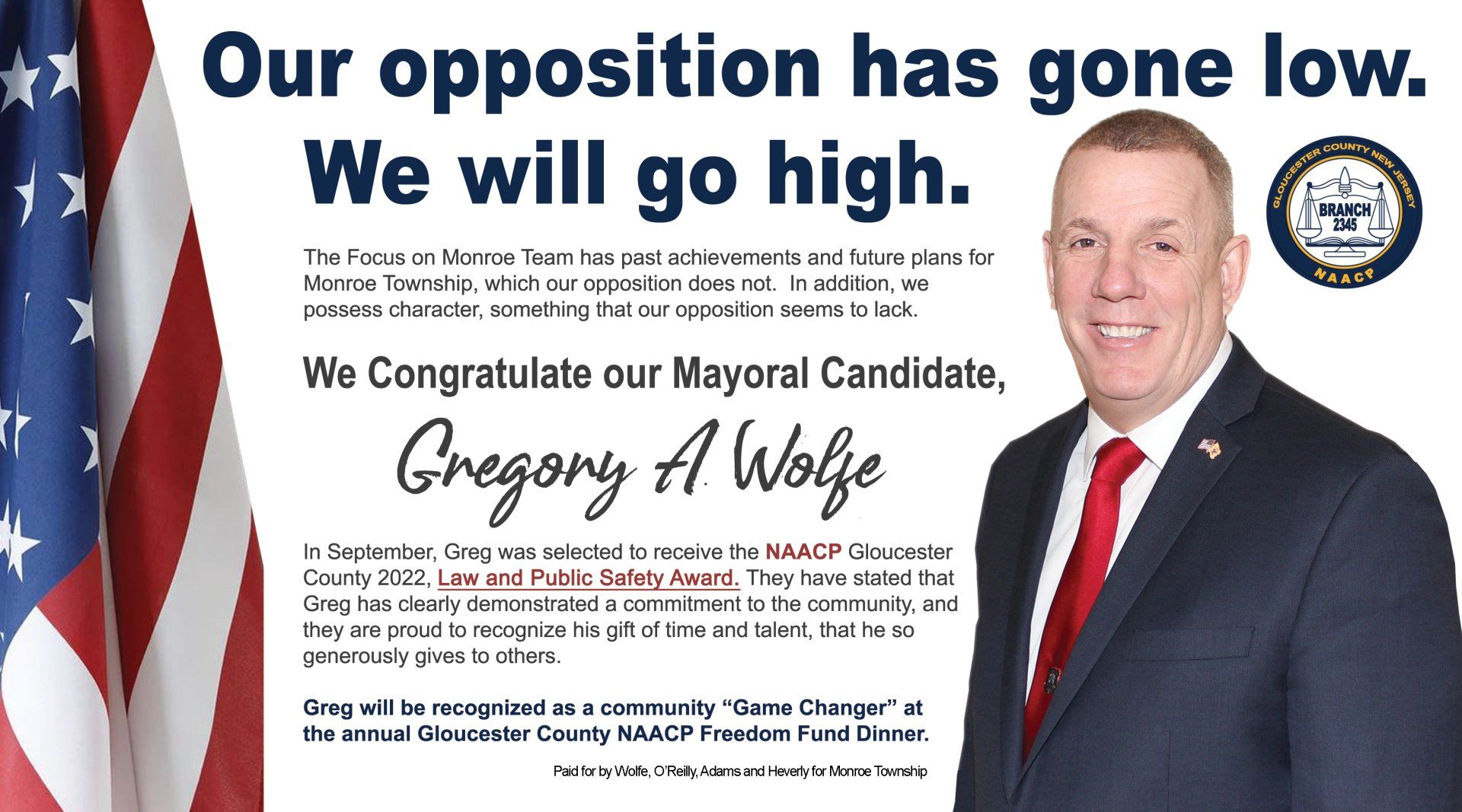 “Greg Wolfe protected me as I was being attacked on September 27, 2006, while working as a Monroe Township Parks and Rec’s employee. In fact, Greg Wolfe was the only person who came to my aid that night, during the attack. The smear tactics from Greg’s opposition are despicable and untrue.”